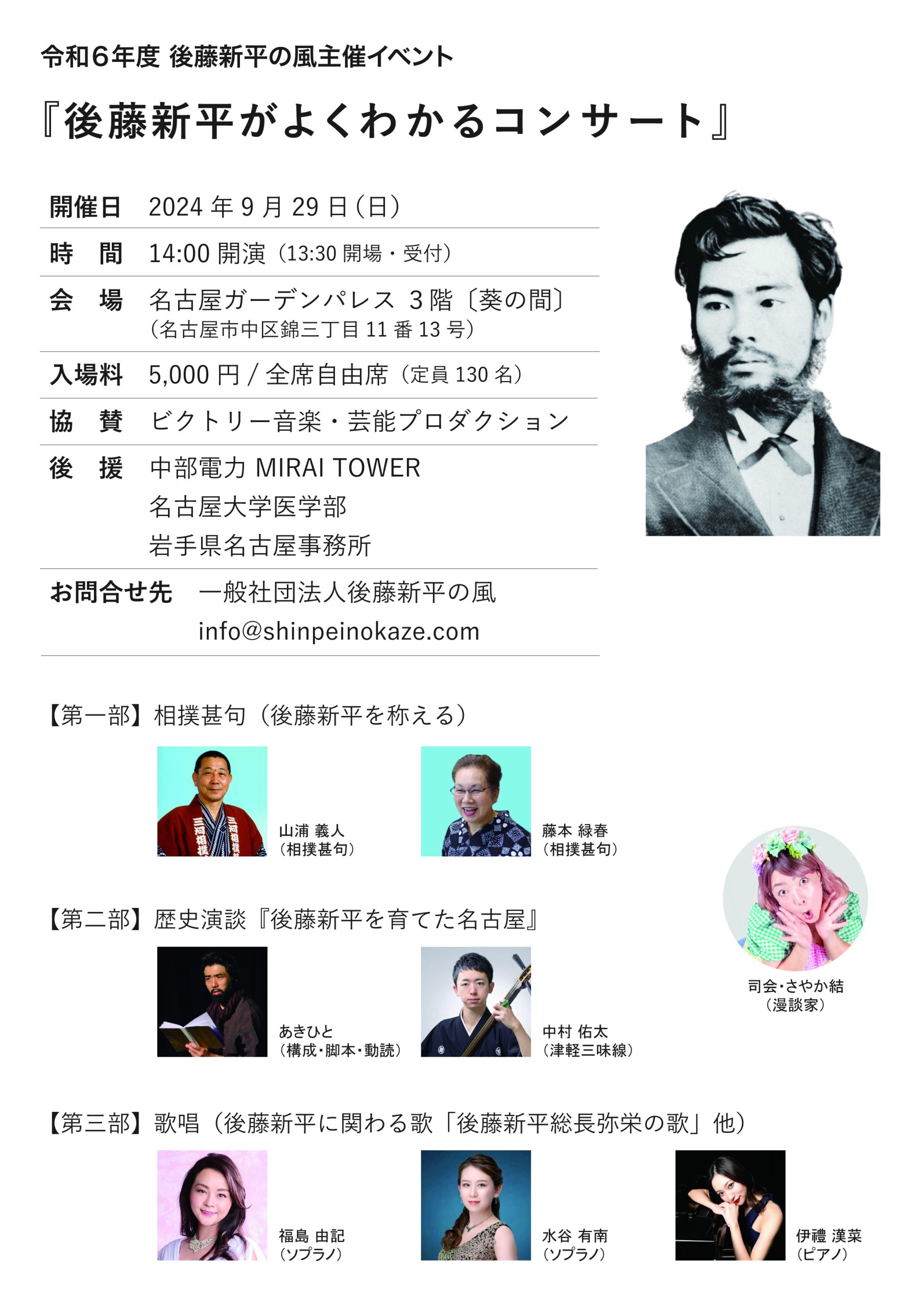 令和6年度 後藤新平の風主催イベント『後藤新平がよくわかるコンサート』のお知らせ HOME ニュース 令和6年度 後藤新平の風主催イベント『後藤新平がよくわかるコンサート』のお知らせ Tweet Share Tweet Share 「後藤新平と名古屋の関わり」集合写真を掲載しました。 令和6年度 後藤新平の風主催イベント「後藤新平と大須・大光院」お知らせ 令和6年度 後藤新平の風主催イベント「後藤新平と大須・大光院」お知らせ 令和6年度 後藤新平の風主催イベント『後藤新平がよくわかるコンサート』のお知らせ 「後藤新平と名古屋の関わり」集合写真を掲載しました。 後藤新平と名古屋の関わり 第1回イベント 【後藤新平の遺訓】読売新聞販売店の特選コラム掲載 【新平の大河ドラマ】読売新聞販売店の特選コラム掲載 後藤新平の風ウェブサイト公開いたしました。