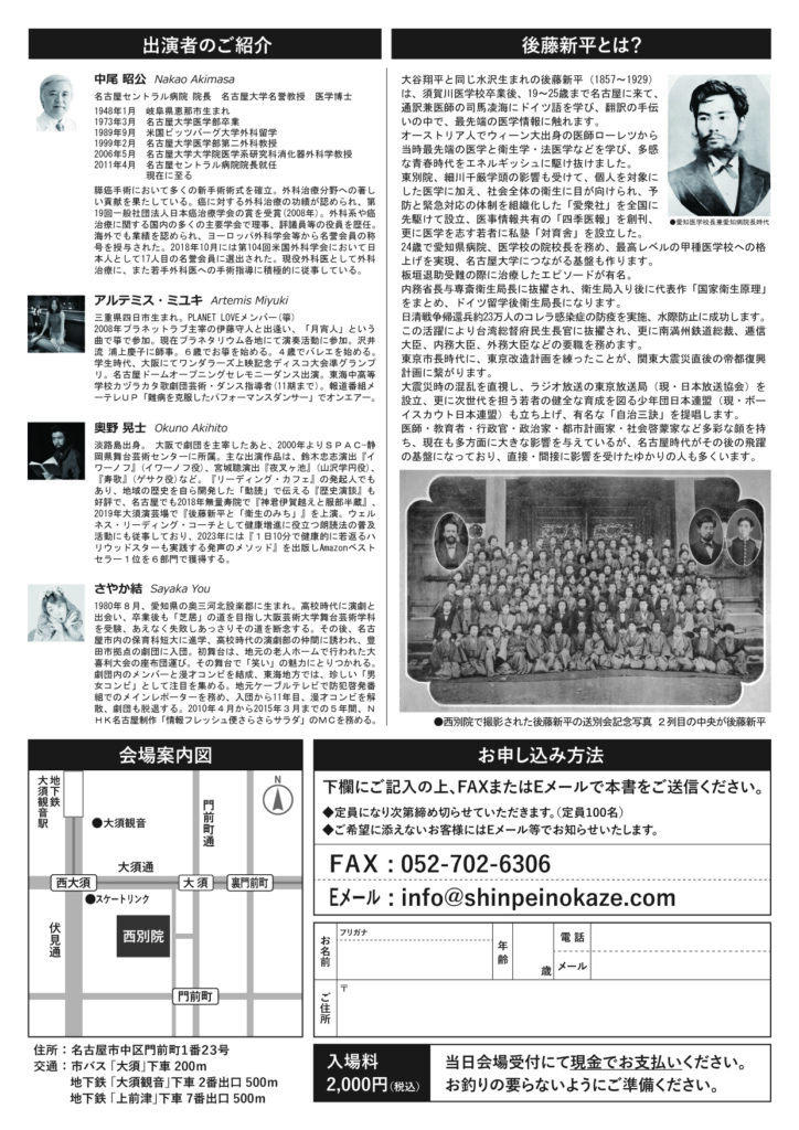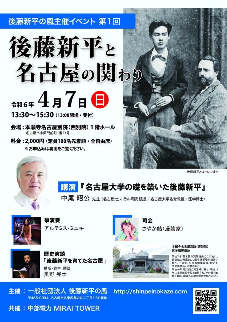 後藤新平と名古屋の関わり 第1回イベント HOME ニュース 後藤新平と名古屋の関わり 第1回イベント Tweet Share 後藤新平の風主催イベント 第1回 後藤新平と名古屋の関わり 令和6年4月7日(日) 1 ファイル 3 MB ダウンロード Tweet Share 【後藤新平の遺訓】読売新聞販売店の特選コラム掲載 「後藤新平と名古屋の関わり」集合写真を掲載しました。 令和6年度 後藤新平の風主催イベント「後藤新平と大須・大光院」お知らせ 令和6年度 後藤新平の風主催イベント『後藤新平がよくわかるコンサート』のお知らせ 「後藤新平と名古屋の関わり」集合写真を掲載しました。 後藤新平と名古屋の関わり 第1回イベント 【後藤新平の遺訓】読売新聞販売店の特選コラム掲載 【新平の大河ドラマ】読売新聞販売店の特選コラム掲載 後藤新平の風ウェブサイト公開いたしました。